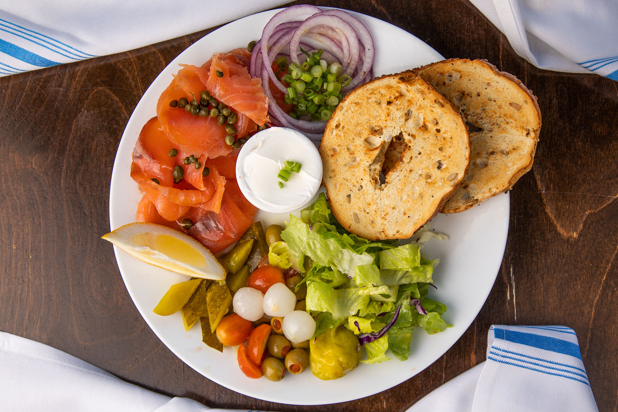 Nova Lox Smoked Salmon, Tomato, Onion, Cucumber, Capers, Toasted Bagel and Cream Cheese